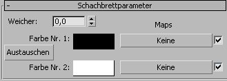 Weist dem Material ein zweifarbiges Schachbrettmuster zu. Schachbrett-Maps sind zweidimensionale Prozedur-Maps mit der Vorgabeeinstellung eines Musters aus schwarzen und weißen Quadraten. Die einzelnen Karos können Farben oder Maps sein.