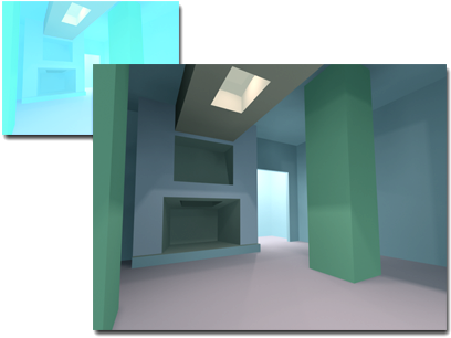 Rechts: Eine bessere Radiositäts-Lösung erzielen Sie durch Verringern der Einstellung für den HSV-Wert (V) der Materialien in der Szene.