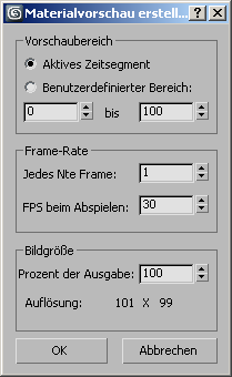 Wenn Sie auf "Vorschau erstellen" klicken, um eine Vorschau eines animierten Materials zu generieren, wird das Dialogfeld "Materialvorschau erstellen" angezeigt. Vorgabegemäß wird der Vorschaufilm im Unterverzeichnis \previews in der Datei _medit.avi gespeichert. Sie können die Vorschau mit "Vorschau speichern" unter einem anderen Namen speichern, sodass sie bei der nächsten Erstellung einer Vorschau nicht überschrieben wird.