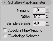 Das Rollout "Schatten-Map-Parameter" wird angezeigt, wenn für die Lichtquelle das Schatten-Mapping als Methode zur Schattengenerierung ausgewählt ist. Das Schatten-Mapping wird im Rollout "Allgemeine Parameter" ausgewählt.