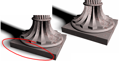 Wenn der Neigungswert zu niedrig ist, können Schatten in Bereiche "auslaufen", in die sie nicht gehören, und so verschwommene Muster oder falsch platzierte dunkle Stellen auf Netzen erzeugen. Ist die Neigung zu hoch, können sich die Schatten vom Objekt "lösen". Wenn die Neigungswerte in die eine oder andere Richtung zu extrem sind, kann es sein, dass die Schatten überhaupt nicht gerendert werden.