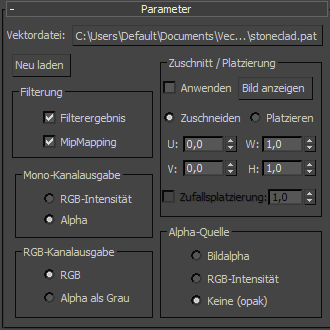 Einige Parameter wie beispielsweise Opazität oder Glanzfarbenstärke verfügen im Gegensatz zu den aus drei Werten bestehenden Farbkomponenten eines Materials nur über einen einzigen Wert. Mit den Steuerelementen dieses Bereichs wird die Quelle des Ausgabe-Mono-Kanals in Form einer Eingabe-Vektor-Datei festgelegt.