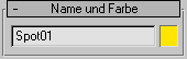 Im Rollout Name und Farbe können Sie den Namen und die Geometriefarbe einer Lichtquelle ändern. Die Farbe der Lichtgeometrie zu ändern kann hilfreich sein, wenn Sie mit vielen Lichtquellen arbeiten. Wenn Sie beispielsweise eine Szene mit vielen verschiedenen Lichttypen haben, können Sie alle Spotlichter rot und alle Omnilichter blau machen, um sie auf einen Blick unterscheiden zu können.