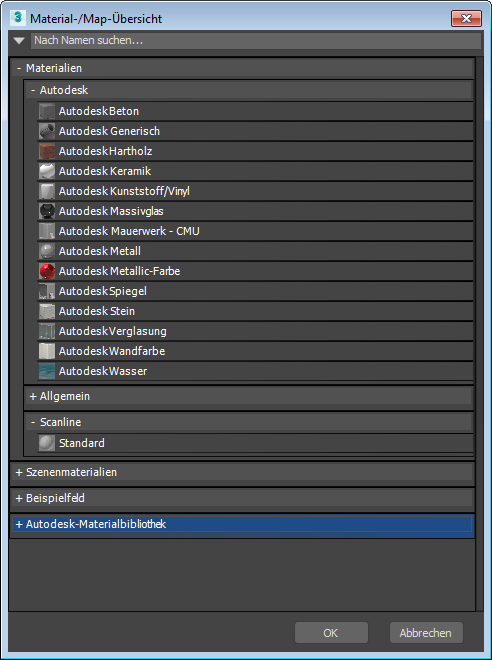 Geben Sie Text in das Feld zum Suchen nach Materialien und Maps ein, deren Namen mit den eingegebenen Buchstaben beginnen. Bei der Suche wird nicht zwischen Groß- und Kleinschreibung unterschieden.