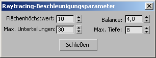Mit den Steuerelementen in diesem Dialogfeld können Sie die vorgegebenen Beschleunigungswerte überschreiben und Ihre eigenen Anforderungen festlegen. In der Regel benötigen Sie die Steuerelemente nicht. Wenn Sie aber mit den Erfordernissen Ihrer Szene vertraut sind, können die Steuerelemente beim Optimieren des Raytrace-Renderns unter Ihren jeweiligen Anforderungen und Zeitbeschränkungen nützlich sein.