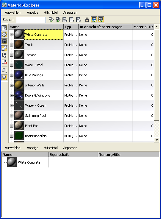 Mit dem Material-Explorer können Sie nach allen Materialien in der Szene suchen und diese verwalten.