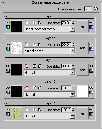 Das zusammengesetzte Map verwendet pro Layer ein separates Rollout für die Steuerelemente, d. h. es gibt so viele Rollouts wie Layer. Jedes Layer-Rollout hat als Bezeichnung einen optionalen Namen, gefolgt von "Layer" und anschließend die Nummer des Layers.