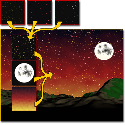 Durch ein Map des Typs "Zusammensetzen" werden Sterne, Mond und ein Leuchten zu einem Himmel kombiniert.