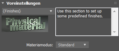 Sie können auch eine Voreinstellung (Vorlage) als Ausgangspunkt zum Erstellen eines benutzerdefinierten Materials verwenden. Wählen Sie aus der Dropdown-Liste eine Vorlage aus. Im rechten Fensterbereich wird eine Beschreibung mit allgemeinen Anweisungen angezeigt.