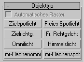 Informationen zu Parametern für eine bestimmte Art von Lichtquelle finden Sie in der Beschreibung des jeweiligen Lichtquellentyps. Parameter für Standardlichtquellen im Allgemeinen sowie spezifische Rollouts für Spotlichter und Richtungslichter werden in diesem Abschnitt beschrieben.