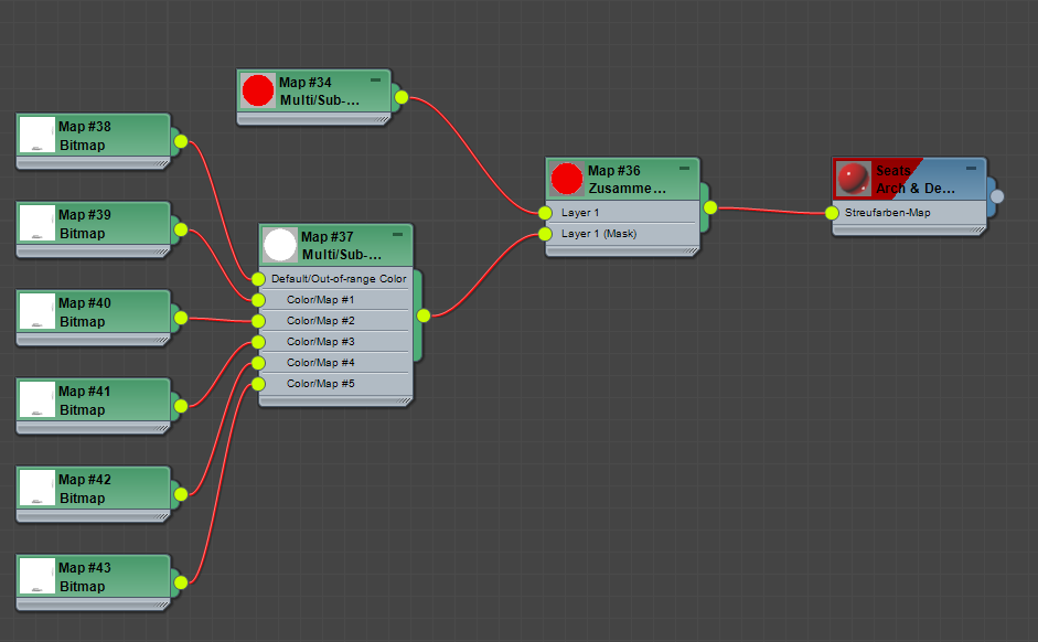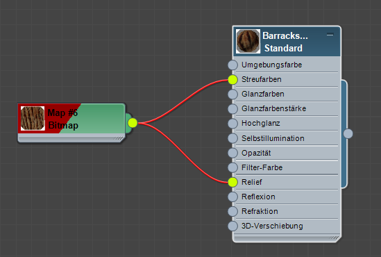 Anmerkung: Wenn Sie ein Material auf diese Weise ziehen und ablegen, wird es nicht in die Vernetzung eingefügt. Stattdessen wird das Map nun als Eingabe sowohl für dieses Material als auch das ursprüngliche Material verwendet. Die Ausgangsbuchse des neuen Materials bleibt frei (wird nicht vernetzt).
