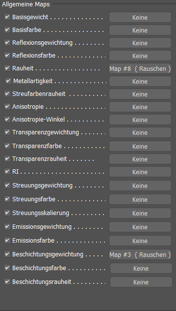 In diesem Rollout können Sie vielen Parametern für physikalisches Material eine Map oder einen Shader zuweisen. Sie können Maps und Shader auch auf dem Rollout zuweisen, in dem der Parameter zuerst angezeigt wird. Dieser Parameter lässt sich umschalten. Somit können Sie den Shader mithilfe des Kontrollkästchens aktivieren oder deaktivieren, ohne die Map zu entfernen.