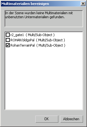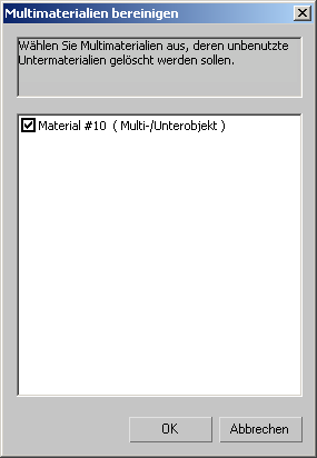 In diesem Dialogfeld wird eine Liste mit sämtlichen Multi-/Unterobjektmaterialien angezeigt, die nicht zugewiesene Untermaterialien enthalten. Alle Multi-/Unterobjekt-Materialien werden automatisch aktiviert und somit auch bereinigt.