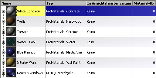 Im Hauptfenster des oberen Fensterbereichs "Szene" des Material-Explorers können sich mehrere Spalten mit Informationen zu den Materialien in der Szene befinden. Einige Spalten enthalten Zellen, die bearbeitet werden können.