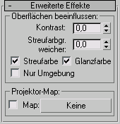 Das Rollout "Erweiterte Effekte" enthält Steuerelemente, die beeinflussen, wie sich die Lichtquellen auf Oberflächen auswirken, und umfasst außerdem eine Reihe von Feineinstellungen für Projektorlichter.