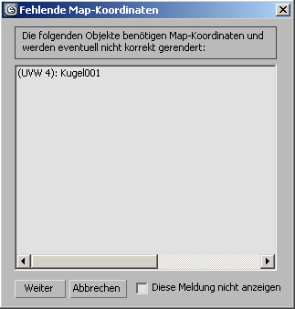 Das Dialogfeld "Fehlende Map-Koordinaten" wird angezeigt, wenn Sie versuchen, ein oder mehrere Objekte mit Materialien zu rendern, die einen anderen Map-Kanal als Kanal 1 verwenden. (Kanal 1 ist eine Ausnahme, weil die Mapping-Koordinaten von Kanal 1 automatisch aktiviert werden, wenn Sie ein zugeordnetes Material einem Objekt zuweisen.) Als fehlend werden nur Maps aufgeführt, für die die Option "Map im Ansichtsfenster zeigen" aktiviert ist.