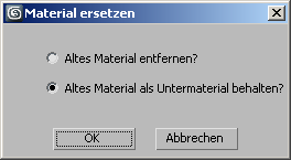 Das Dialogfeld "Material ersetzen" wird angezeigt, wenn Sie als Materialtyp einen Typ für zusammengesetztes Material wählen. In diesem Dialogfeld können Sie anstelle des ("alten") Ausgangsmaterials ein völlig neues Material verwenden, oder Sie verwenden das Ausgangsmaterial als Untermaterial eines neuen Materials.