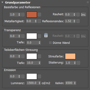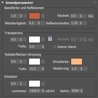 Das Rollout Grundparameter enthält allgemeine Einstellungen für das physikalische Material.