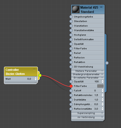 Wenn Sie die Komponenten eines Standardmaterials mappen, fügt der erweiterte Material-Editor automatisch entsprechende Controllerknoten hinzu. Wenn Sie beispielsweise ein Bitmap mit der Streufarbenkomponente des Materials vernetzen, ist auch ein Bezier-Float-Controller für den Streufarben-Betragsparameter vorhanden. Um diese Controller sehen zu können, müssen Sie die zusätzlichen Parameter anzeigen (Klicken Sie mit der rechten Maustaste auf den Materialknoten und wählen Sie dann Alle weiteren Parameter anzeigen).