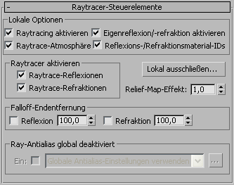 Mit dem Rollout "Raytracer-Steuerelemente" für ein Raytrace-Material wird die Funktionsweise des Raytracers gesteuert. Es kann beim Optimieren der Render-Leistung hilfreich sein.
