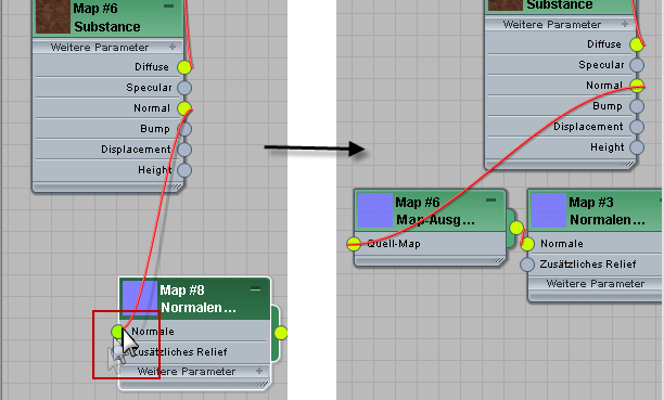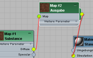 Nach dem Ablegen der Vernetzung fügt 3ds Max wieder automatisch einen Map-Ausgabeselektorknoten zwischen den beiden Knoten ein.