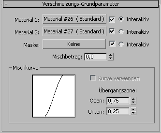 Die Option "Mischbetrag" ist nicht verfügbar, wenn dem Parameter "Maske" ein Map zugewiesen wird. Ist das Kontrollkästchen "Kurve verwenden" deaktiviert, wird das Misch-Map wie angegeben verwendet. Wenn die Option "Kurve verwenden" aktiviert ist, können Sie den Effekt der Verlaufsart für das Masken-Map mithilfe der Mischkurve so verschieben, dass von einem Material mehr und von dem anderen Material weniger sichtbar wird.