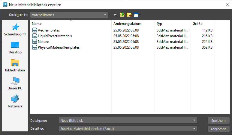 In 3ds Max wird ein Dateidialogfeld geöffnet, in dem Sie die Bibliothek (MAT-Datei) auswählen können, in der das Material gespeichert werden soll.