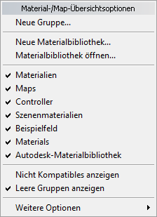 Wenn Sie eine dieser Optionen deaktivieren, werden die entsprechenden Materialien und Maps (z. B. Maps in der aktuellen Umgebung) nicht mehr in der Gruppe "Szenenmaterialien" angezeigt. Wenn Sie eine Option wieder aktivieren, werden die entsprechenden Materialien und Maps wieder angezeigt.