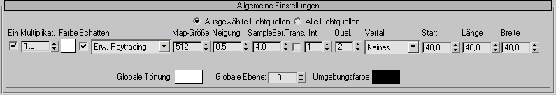 - Alle Lichtquellen Wenn diese Option aktiviert ist, gelten die allgemeinen Einstellungen für alle Lichtquellen in der Szene (die Anzahl der Lichtquellen ist, wie oben beschrieben, auf 150 Lichtquellen beschränkt).