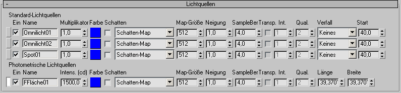 Dieses Rollout wird angezeigt, wenn die Optionen "Alle Lichtquellen" oder "Ausgewählte Lichtquellen" im Rollout "Konfiguration" aktiviert sind. Seine Steuerelemente beziehen sich auf einzelne Lichtobjekte. In diesem Rollout werden zwei Listen angezeigt: eine für Standardlichtquellen und eine für fotometrische Lichtquellen.