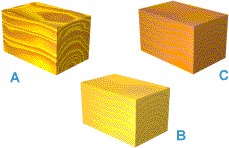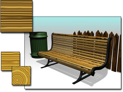 Die Wahl der Farben ist neben der Bestimmung des Maserungsmusters die wichtigste Methode, um die unterschiedlichen Holzsorten darzustellen. Bei relativ gleichmäßigen Holzsorten wie Kiefer oder Mammutbaum weichen die Einstellungen der beiden Farben oft nur geringfügig voneinander ab (Beispiel B und C). Auch die Wahl der Beleuchtung ist für die angezeigten Farben von Bedeutung.