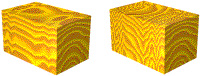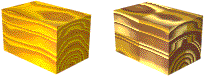 Für den linken Quader gelten die Vorgabewerte. Der rechte Quader entspricht dem linken, wobei jedoch Farbe Nr. 1 durch ein Schachbrett-Map ersetzt wurde, dessen Farben in Holztöne verändert wurden.