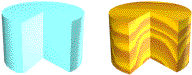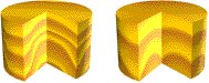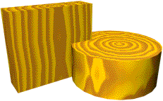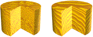 Andere Winkeleffekte: Durch Verstellen von nur einem Winkel kann eine Verzerrung der Maserung erzeugt werden (siehe Zylinder links). Werden alle drei Winkel um denselben Betrag verändert, verläuft die Maserung weiterhin parallel durch das Objekt (Zylinder rechts).