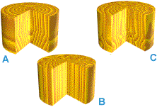 Die Zylinder A und B zeigen die Parameter einzeln. Zylinder C zeigt, wie dieselben Einstellungen zusammenwirken.