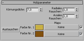 Holz dient in erster Linie als Streufarben-Map. Die Maserung von Holz (auch als Körnungsmuster bezeichnet) wird durch die Mischung von zwei Farben erzeugt. Sie können eine oder beide Farben durch andere Maps ersetzen.