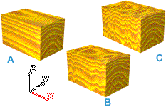 Vorgabekörnung: Holz wird so gerendert, dass die Maserung auf der X-Achse des Objekts verläuft. Dieser Effekt wird vom Würfel unten links illustriert. Der Vorgabewinkel für die X-, Y- und Z-Achse ist jeweils 0.