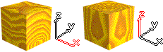 Gedrehte Maserung: Durch Drehen der Maserungsrichtung um eine Achse wird der Rendereffekt verändert. Im rechten Würfel ist die Y-Achse auf 90 festgelegt. Mit dieser Option drehen Sie die Körnungsrichtung um 90 Grad um die Y-Achse, sodass die Körnung entlang der Z-Achse verläuft.