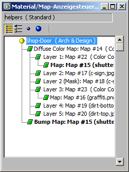 Die Anzeigesteuerung zeigt das Material und die Maps im aktiven Musterfeld an. Sie können sich durch die Hierarchie des aktuellen Materials bewegen, indem Sie auf das in der Anzeigesteuerung aufgeführte Material oder Map klicken. Umgekehrt wird die aktuelle Ebene in der Anzeigesteuerung markiert, wenn Sie sich im Material-Editor durch das Material bewegen. Das ausgewählte Material oder Map wird im Musterfeld aktiv, und unter den Musterfeldern erscheinen die Rollouts für das ausgewählte Material oder Map.