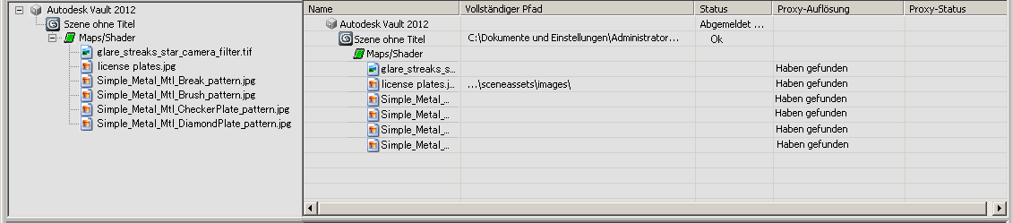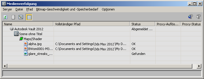 Außerdem werden für die einzelnen Medien Symbole für den Medientyp (3ds Max-Szenendatei, Map-Zweig usw.) und Status angezeigt. Die meisten Statussymbole werden in der Hilfe zum Vault-Explorer
