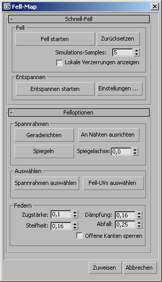 Hier finden Sie die Hauptsteuerelemente der Simulation, in der die am Spannrahmen befestigten Federn die Nahtscheitelpunkte nach außen ziehen und die UVs auf diese Weise abflachen. Die besten Ergebnisse erzielen Sie, wenn Sie abwechselnd die Simulation ausführen (durch Klicken auf "Fell starten") und das Netz entspannen.