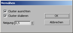 Wenn "Cluster skalieren" deaktiviert ist, bestimmt diese Einstellung das Ausmaß, um das angehängte Unterobjekte von ihrer ursprünglichen Position weg bewegt werden. Bei "Neigung" = 0 bleiben die Unterobjekte in ihrer ursprünglichen Position im Quellcluster. Bei "Neigung" = 1 bleiben die Unterobjekte in ihrer ursprünglichen Position im Zielcluster. Bei Werten zwischen diesen beiden Werten wird ihre Position als Durchschnitt zwischen den beiden Clustern berechnet.