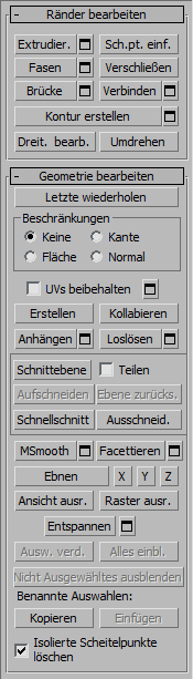 Ausführliche Beschreibungen dieser Steuerelemente finden Sie unter Rollout "Geometrie bearbeiten" ("Polynetz" und "Poly bearbeiten").
