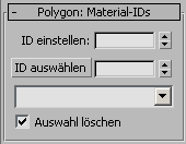 Wählt Polygone aus, die der im benachbarten ID-Feld angegebenen Material-ID entsprechen. Geben Sie durch Eingabe oder über das Zahlenauswahlfeld eine ID an, und klicken Sie danach auf die Schaltfläche "ID auswählen".
