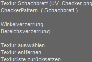 Das Textur Schachbrett (UV-Checker.png) ist nützlich, um die UV-Richtung und die Normalenrichtung zu bestimmen. Dieses Bitmap kann unter \\maps\uvwunwrap ersetzt werden.