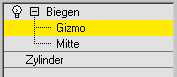 Auf dieser Unterobjektebene können Sie das Gizmo wie jedes andere Objekt transformieren und animieren und so die Wirkung des Modifikators "Biegen" ändern. Durch eine Versetzung des Gizmos wird sein Mittelpunkt um die gleiche Entfernung versetzt. Drehen und Skalieren des Gizmos findet in Bezug auf seinen Mittelpunkt statt.