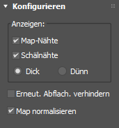 Wenn die Option aktiviert ist, werden Schäl- und Fellnähte in den Ansichtsfenstern als blaue Linien angezeigt. Weitere Informationen dazu finden Sie unter Rollout Schälen.