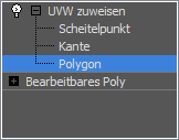 Normalerweise bietet der Modifikatorstapel bei Anwendung von UVW zuweisen auf ein Objekt Zugriff auf Texturkoordinaten auf den Unterobjektebenen Scheitelpunkt, Kante und Polygon. Die Unterobjektebenen Scheitelpunkt und Kante eignen sich zur Auswahl von UVW-Scheitelpunkten und -Kanten in Ansichtsfenstern, in denen das Textur-Mapping auf der Objektoberfläche deutlicher sichtbar ist. Die Ebene Kante eignet sich außerdem zum Auswählen von Kanten, die Sie später in Nähte für die Fell- und Schälwerkzeuge umwandeln können.