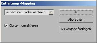 Mit der Prozedur-Mapping-Methode "Entfaltungs-Mapping" werden Texturverzerrungen verhindert, es können jedoch überschneidende Koordinaten-Cluster entstehen. Im Dialogfeld "Entfaltungs-Mapping" können Sie die Entfaltung von Flächen steuern.
