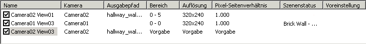 Standardmäßig rendert eine Aufgabe das aktive Ansichtsfenster wie in der Aufgabenwarteschlange in der Spalte "Kamera" für den Eintrag "Ansichtsfenster" angegeben. In dieser Liste können Sie eine beliebige Kamera der Szene für die markierte Aufgabe auswählen. Diese neue Kamera wird in der Spalte "Kamera" der Aufgabenwarteschlange angezeigt.