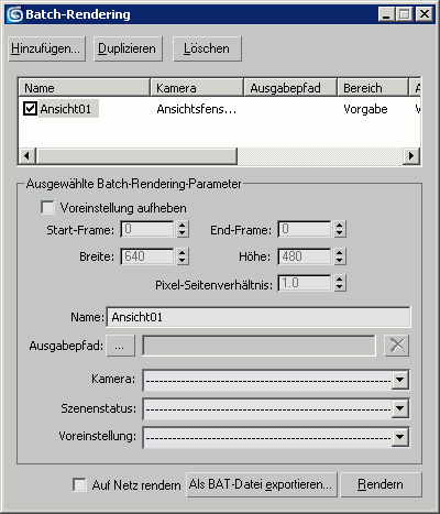 Anmerkung: Das Dialogfeld "Batch-Rendering" wird zum Rendern verschiedener Aspekte der gleichen Szene verwendet, beispielsweise Ansichten von verschiedenen Kameras. Verwenden Sie zum Batch-Rendern verschiedener Szenen das Programm Backburner oder Befehlszeilen-Rendern.